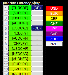 The Currency Array indicator has been developed to measure and display quickly and easily, the speed at which currency pairs are rising and falling. Just like the Quantum Currency Matrix, the Quantum Currency Array indicator displays the complete array of 28 currency pairs derived from the 8 major currency pairs as featured in the Quantum Currency Strength Indicator: